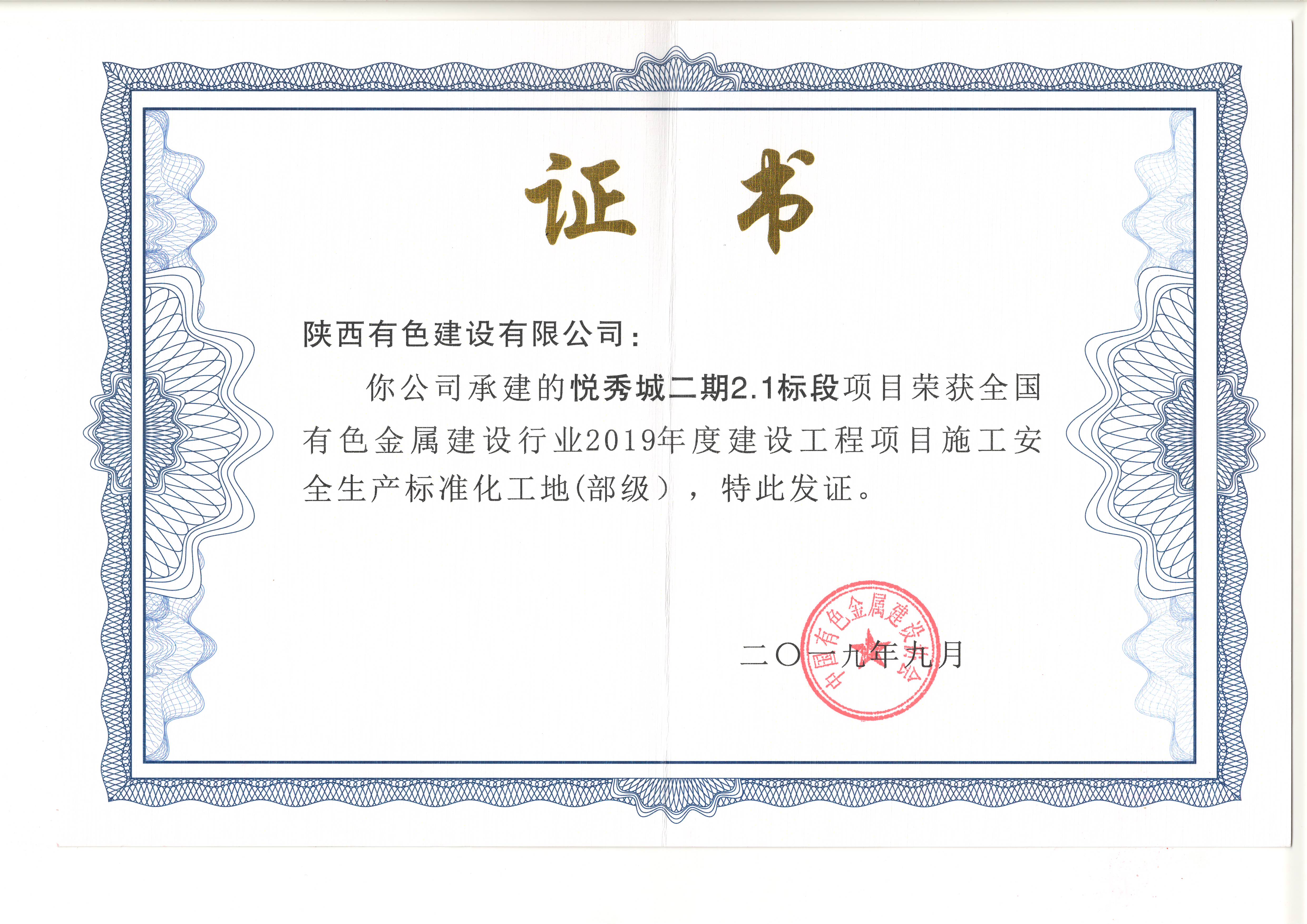 近日,從中國有色金屬建設(shè)協(xié)會傳來喜訊,公司西安鵬潤悅秀城項目榮獲“全國有色金屬建設(shè)行業(yè)2019年度建設(shè)工程項目施工安全生產(chǎn)標(biāo)準(zhǔn)化工地”稱號。